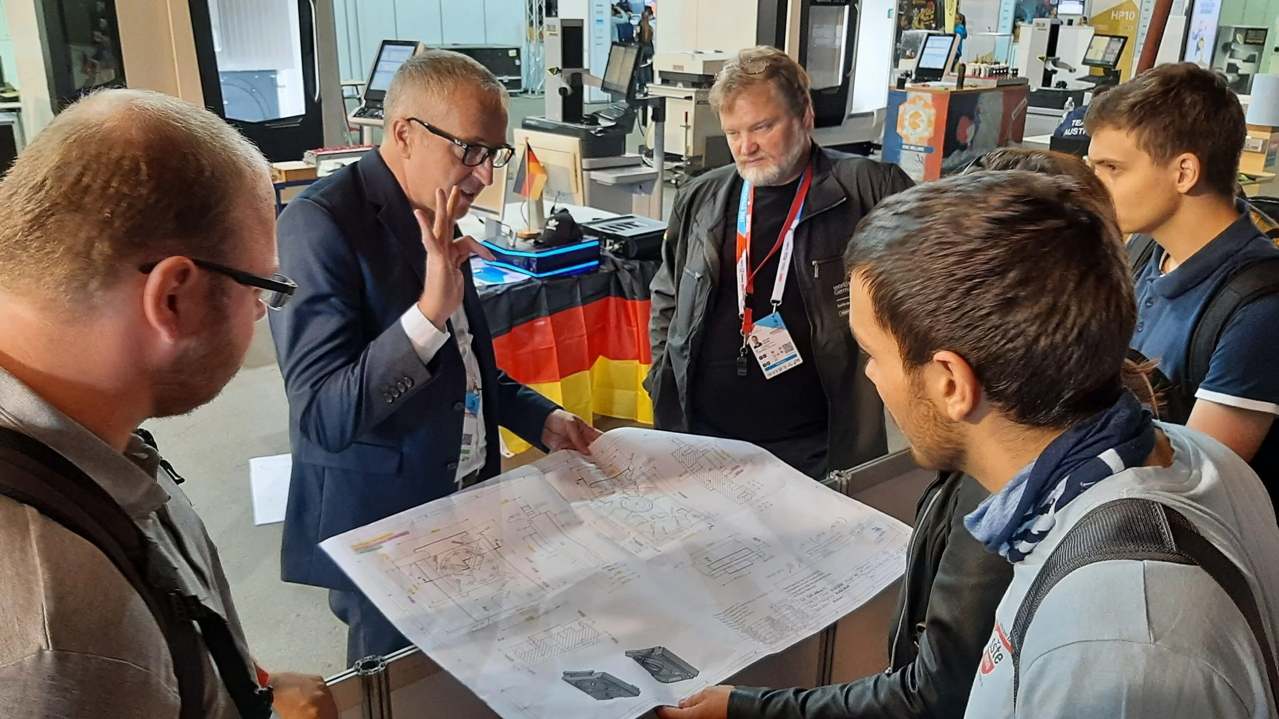 A poté už nás čekala slavná Davis Cup Halle, kde byly soustředěny všechny „Skills“ v oboru Manufacturing and Engineering Technology. Najisto jsme zamířili k higlightu 07-CNC Milling. V rámci pátečního dne pro rakouské školy jela na plno akce „Try a skill“, kdy si studenti mohli vyzkoušet všechny soutěžní disciplíny pod vedením expertů daného oboru. A tak jste se mohli stát vším, čím jste si kdy přáli být: kadeřníkem truhlářem, malířem nebo návrhářem a také třeba tvůrcem počítačové hry. My jsme si ale popovídali v rámci téhle akce s šéfem akademie DMG MORI v Bielefeldu panem Joergem Harringsem, který nám přiblížil první soutěžní den a pak jsme se setkali společně i s hlavním expertem pro frézování panem Herbertem Mattesem a diskutovali jsme nad technickým výkresem prvního soutěžního dne. Na řadu tak vlastně přišla další dovednost – ta, se kterou se na mezinárodní úrovni automaticky počítá: angličtina a je dobré vědět, že kluci obstáli. Naši soutěžící ze Skills Czech Republic, z.ú se tak mohli podívat o čem je velké evropské finále. A při tom všem ruchu okolo se programovalo a testovalo. Osm finalistů soutěže ve frézování mělo k dispozici čtyři pětiosé obráběcí stroje CMX50U a 4,5 hodiny čistého času na obrábění a programování. My jsme bohužel finálový den na místě nezažili, a tak až ze závěrečného ceremoniálu jsme se dozvěděli, že vítězství v této disciplíně putuje do Ruska.