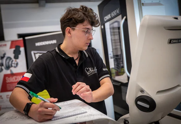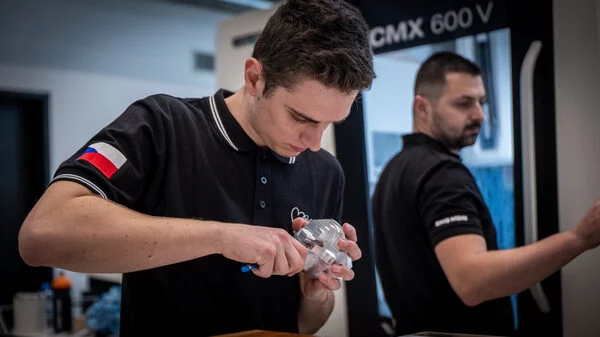 A jak to bylo letos? Mám pocit, že ten odpal vyšel skvěle a těžká jamka s názvem „druhý ročník soutěže o mistra v CNC frézování“ je minimálně na golfové birdie… Bylo to prostě skvělé! Jednoznačně jsme letos zvedli laťku, protože světové soutěže ji opravdu mají pro nás nebývale vysoko a nikdo ji kvůli České republice opravdu snižovat nebude. Kluci si letos sami museli stanovit řezné podmínky a měli jsme pro ně připraven dílec, který se obráběl z více než dvou stran. První dílec – výzva jako hrom, sáhli jsme po originálním výkresu ze švýcarské národní soutěže SkissSkills Bern 2018. Nově nastavenou laťku naši letošní finalisté zvládli skvěle a bylo skutečně radostí se na kluky dívat. Nejen to, jak bezvadně zvládali obsluhu stroje, ale ve chvílích, kdy bylo trochu volno spolu diskutovali a probírali všechno důležité. Navíc jsme si pozvali letos dva moc milé hosty. Přijel za námi Jirka Hruška, do té doby úřadující mistr republiky a také Patrik Šimko, loňský první vícemistr. Tihle kluci z loňského finále se postarali o bezvadnou atmosféru, pomáhali nám s organizací a pustili jsme se i trochu do velkých emocí, protože to byli právě oni, kteří předávali ceny a diplomy finalistům. Je to fantastický pocit, když víte, že tihle mladí muži zvládnou vzít do ruky technický výkres, orientovat se v něm, naprogramovat dílec v SolidCAM, nastavit si řezné podmínky i stroj, vyrovnat se s technologií, dílec vyrobit, proměřit a ve stanovené lhůtě ho odevzdat k hodnocení. Vyráběli jsme dva dílce, průměrný čas na programování tři hodiny a obrábění cca 2,5. Všech pět kluků odevzdalo hotové kusy. Paráda! Co se úrovně týká, tak jen poznámka, že v současné době jsou v České republice jen čtyři školy, které zvládnou kvalifikační a finálová zadání: SŠTE Olomoucká, Brno, SOU Domažlice, GJP a SOŠ ve Slavičín a SŠT Kolofík v Opavě. Ano, můžeme se ptát jako Cimrman „Není to málo?“…